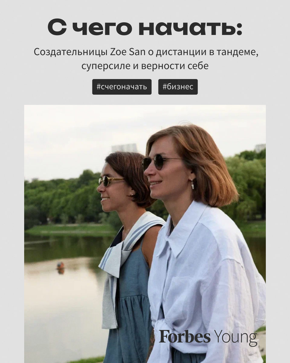 Forbes Young продолжает рубрику «С чего начать», в которой предприниматели и эксперты делятся своим опытом и знаниями о том, как строить и масштабировать бизнес, не теряя энтузиазма и мотивации. Их наблюдения и практические советы помогут начинающим предпринимателям избежать грубых ошибок, а тем, кто только планирует открыть свое дело, — определиться, готовы ли они к тому, что их ждет. Новые героини рубрики — основательницы бренда женской одежды Zoe San Наталия Алексеева и Екатерина Пелипенко. Девушки признаются, что с самого начала не допускали мысли, что бизнес может не сложиться, потому что нашли друг в друге идеальных партнеров, у каждого из которых есть свои суперсилы. Сегодня у Zoe San шоурум, онлайн-магазин и два производства. Девушки рассказывают, что, в отличие от других брендов, не шьют капсулы, а выпускают новинки каждую неделю, чтобы сотрудники на производстве были равномерно загружены. Об отношениях в бизнес-тандеме, минимальном стартовом капитале и о том, почему, если