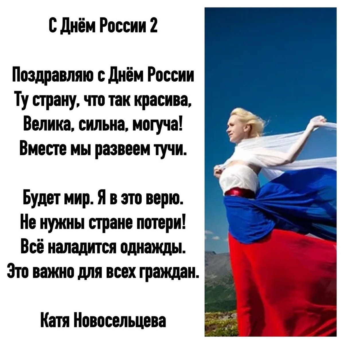 С Днём России 2 Катя Новосельцева Поздравляю с Днём России Ту страну, что так красива, Велика, сильна, могуча! Вместе мы развеем тучи. Будет мир. Я в это верю. Не нужны стране потери! Всё наладится однажды. Это важно для всех граждан. 12.06.2023