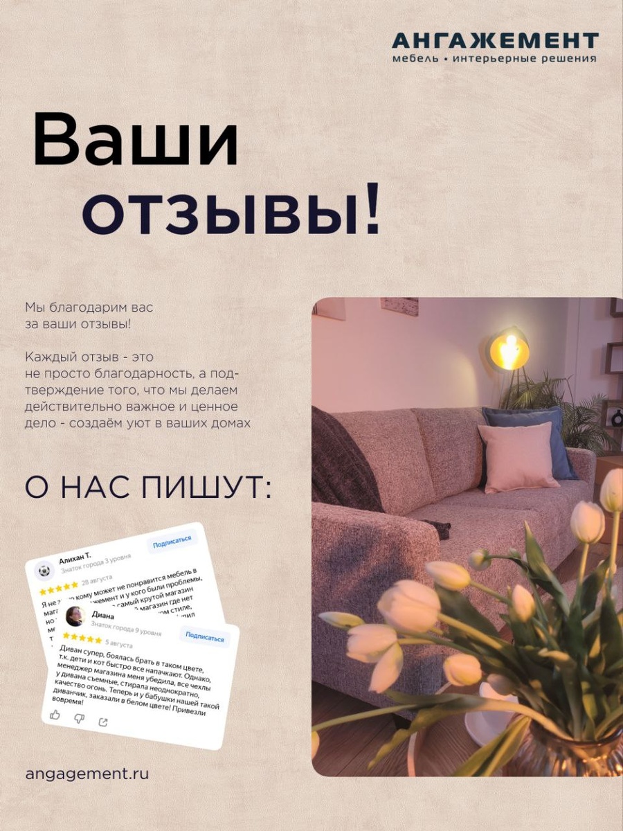 Благодарим вас за отзывы! 😊 Не стесняйтесь делиться впечатлениями и задавать вопросы — мы всегда рядом, чтобы помочь и ответить на любые запросы. ❤️ 📍Адреса магазинов на сайте angagement.ru 📲 Консультация: 8(800)333-50-56 ✅ Подписывайтесь на наши каналы: https://clck.ru/3AGPWT #ангажемент #ангажементкраснодар #мебельныйсалон #мягкаямебель