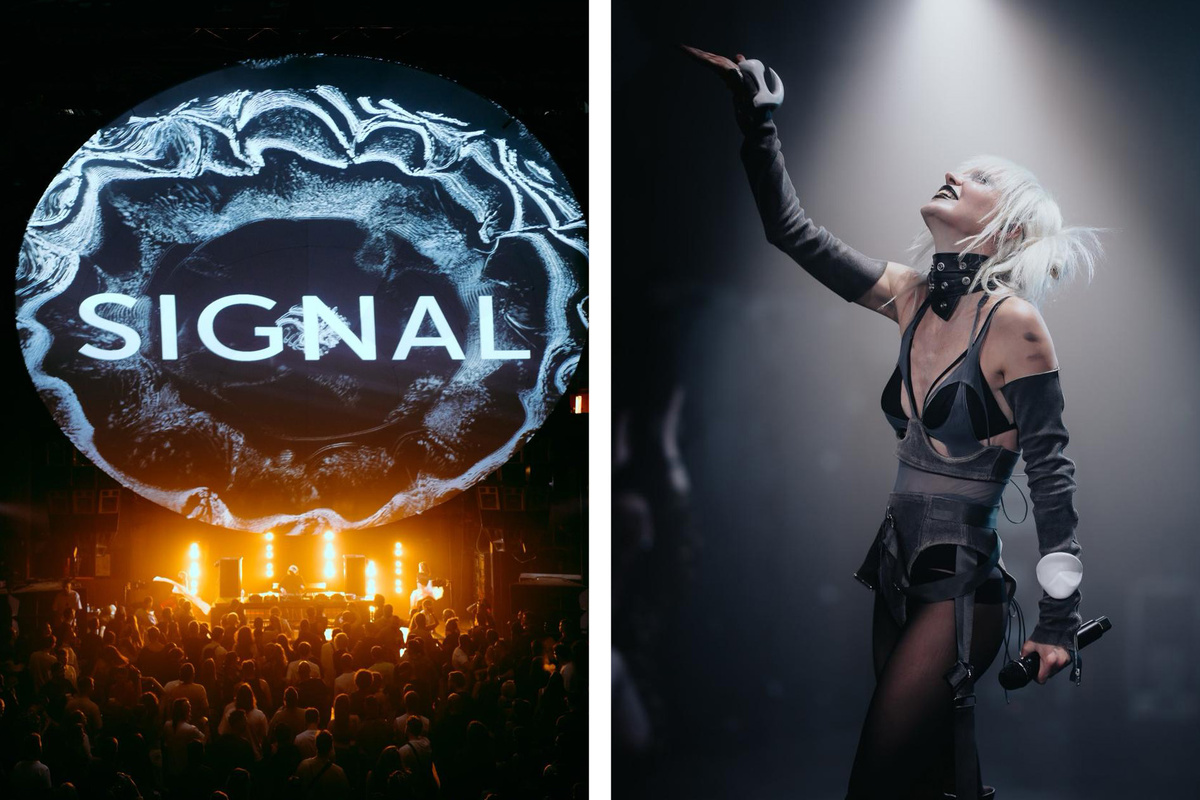 Одной из трёх основных площадок Signal 2025 стал DEX. Здесь получился весьма нестандартный кейс. Мейн клуба совместил в себе программу трёх фестивальных сцен: титульного стейджа Signal — по ночам, концерты с Meadow — вечерами и аудиовизуальные лайвы с Ghosty — днём. Такая нестандартная динамика коснулась как лайн-апа, так и реализованных на мейне технологических решений: части сценографии разных фестивальных сцен были сведены в единый ансамбль и выходили на первый план в зависимости от развития программы. Это касается инсталляции студии СЕТАП с пространственной линзой, изначально спроектированной мной для фестивальной сцены Möbius, и большого светодиодного экрана от Generative Gallery, который планировалось представить на Ghosty. Также в DEX переехал и дизайн-концепт стейджа Rodnya в видоизменённом варианте от студии Sova Show. Фестивальная сцена Kiosko с главным элементом её стейдж-дизайна — 18-метровым светящимся эллипсоидом — воплотилась в уличном танцполе Yard при поддержке «Балтика Вайнот 0».