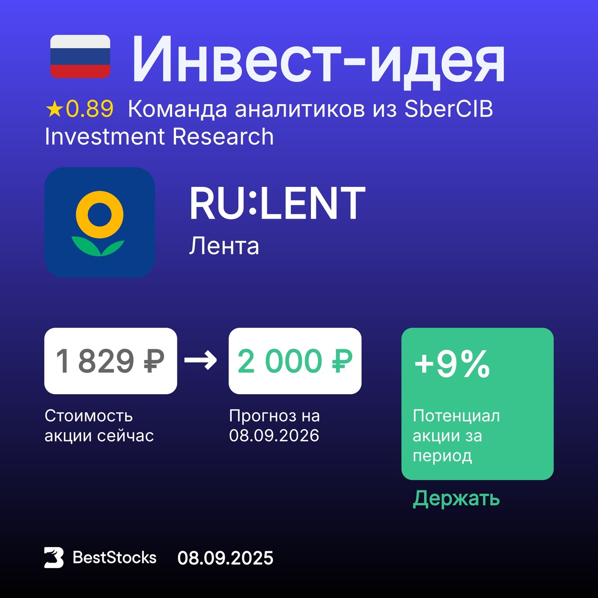 🇷🇺 Инвест-идеи по русским акциям Прогноз по акции Лента Прогнозная цена: 2000 ₽ (+9%) Рекомендация: Держать Дата прогноза: 08.09.2025 Прогноз до: 08.09.2026 Инвест-компания: SberCIB Investment Research Автор прогноза: Команда аналитиков Ещё рекомендации на сегодня → ••••• ❓ Брокер перестал показывать стоимость портфеля? Это можно исправить — BestStocks сделал специальный бесплатный инструмент, который показывает стоимость всех акций в вашем портфеле в реальном времени. Попробовать бесплатно