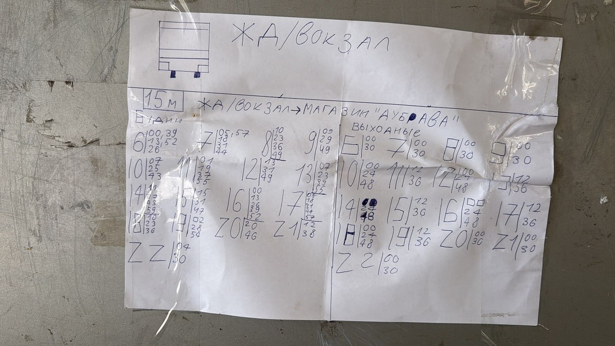 Жители Курска недоумевают по поводу листка бумаги с рукописным расписанием движения автобуса 15м, размещенным на доске объявлений на