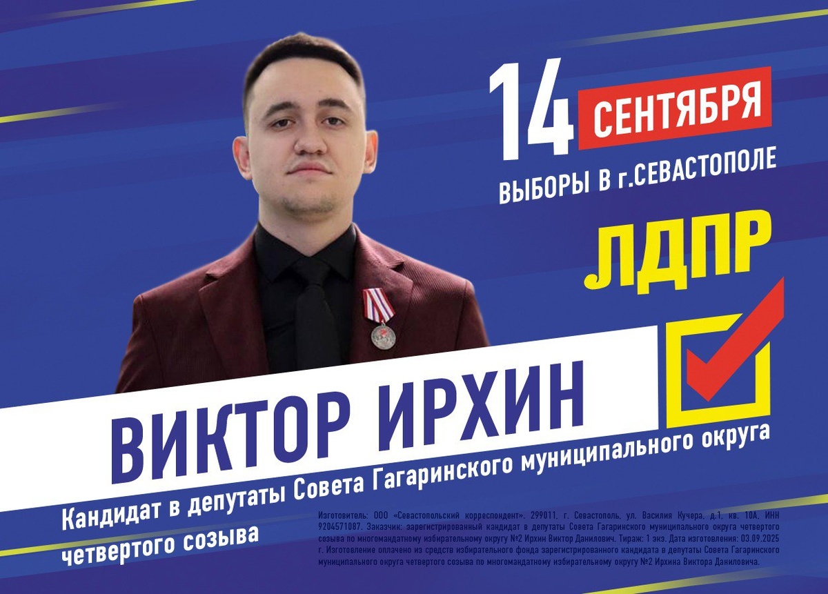 Виктор Ирхин — кандидат в депутаты Совета Гагаринского муниципального округа четвёртого созыва по многомандатному округу №2 Родился 5 июня 2002 года в Горловке, в настоящее время проживает в Севастополе. Образование получил в Севастопольском государственном университете, где изучал судовождение, продолжив обучение в Морском институте. Сейчас он изучает юриспруденцию в Академии труда и социальных отношений на факультете экономики и права. Политическую деятельность начал в ЛДПР в 2019 году. С апреля 2021-го по апрель 2024 года занимал должность координатора Гагаринского местного отделения партии. В 2021 году был секретарём УИК на выборах в Государственную Думу. Активно участвует в волонтёрских проектах и был награждён медалью «Волонтёру России» от 810-й бригады специального назначения. Сегодня он продолжает работать в ЛДПР и готов представлять интересы жителей Гагаринского округа в муниципальном Совете, сочетая молодую энергию с ответственным подходом к общественной и партийной деят