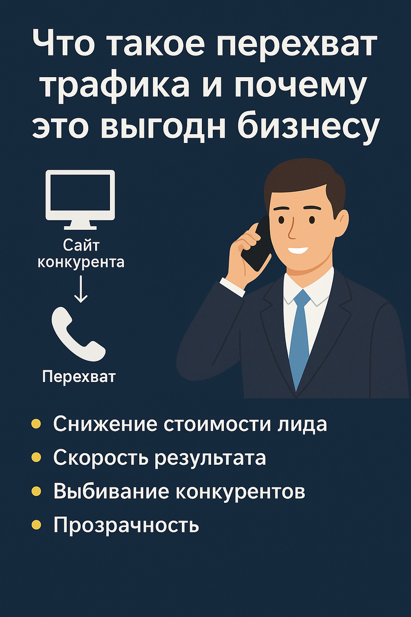 В классическом маркетинге такой контакт уходит в пустоту. Но технология перехвата трафика позволяет этот контакт «подобрать» и предложить ему именно ваши услуги. Вывод: перехват — это не просто альтернатива рекламе, это инструмент прямой конкуренции, где выигрывает тот, кто быстрее и точнее работает с клиентом.