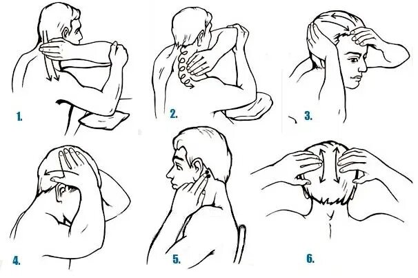 - Поглаживание — от основания черепа вниз к плечам — 1 минута.