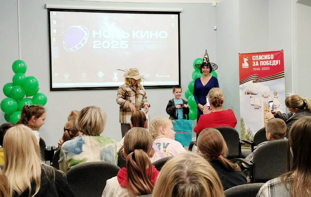 В Модельной детской библиотеке им. Б.С. Рябинина состоялась Всероссийская акция «Ночь кино-2025». Мероприятие объединило юных и взрослых зрителей, которые погрузились в мир кино и сказки. Главным событием мероприятия стал бесплатный показ новинок российского кинематографа: «Волшебник Изумрудного города», «Группа крови» и «Пророк. История Александра Пушкина». Перед фильмом «Волшебник Изумрудного города» гости приняли участие в увлекательной игре. Квест «По дороге из жёлтого кирпича» позволил им встретиться с любимыми персонажами - Железным Дровосеком, Страшилой, Львом и Волшебницей. Роли сказочных героев исполнили библиотекари Светлана Черемискина, Ольга Полюхович, Татьяна Сейплоки, Надежда Олейник и Людмила Мехрякова. Эта атмосфера позволила всем участникам почувствовать себя частью любимой истории, пережить яркие эмоции и незабываемые впечатления. Перед началом киносеансов специальный гость, кунгурский режиссёр Владимир Гладких, приветствовал зрителей и рассказал о своих работах. Акци