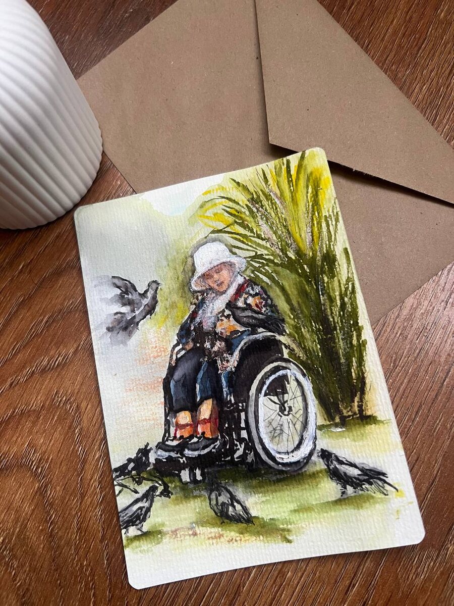Немного погоревала и восстановила ). Мне так даже больше нравится. Остались случайные размытости от предыдущего рисунка и это усиливает очарование акварели, на мой взгляд. Теперь вот хочется подарить эту открытку героине. Мы с ней познакомились, кстати. Она очень милая, открытая, общительная оказалась. Я сказала, что наблюдала как она беседовала с голубями. Она улыбнулась и рассказала, что у неё раньше были куры, коровы, телята, поэтому опыт такого общения имеется).