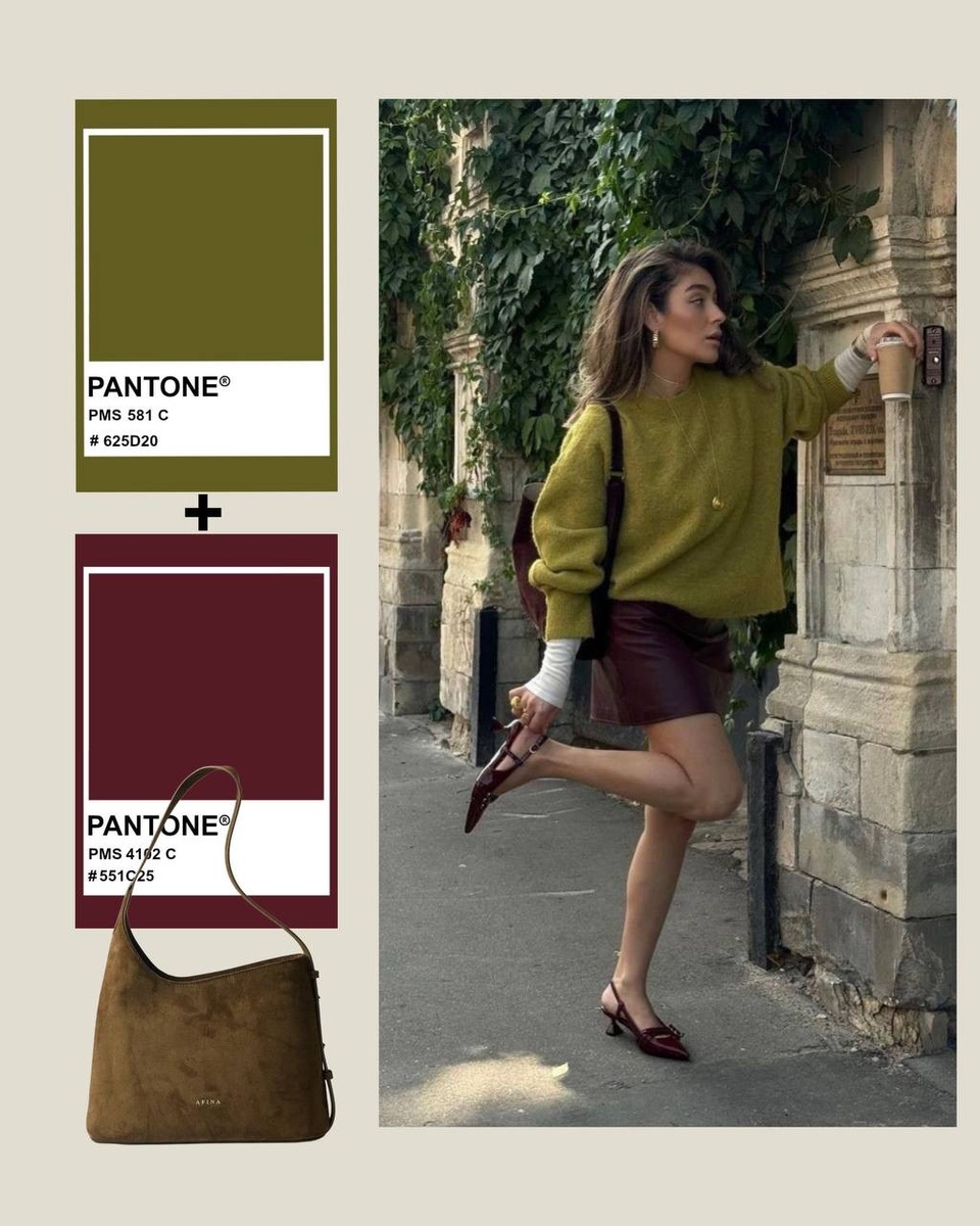 Для уютного времени года Кажется, еще вчера мы выбирали между вьетнамками и босоножками и наслаждались теплыми летними вечерами в ярких цветах. Но в свои права вступает осень, а в меняющейся природе (как и в наших образах) появляются совсем другие оттенки. Изучили выходы модных инфлюэнсеров и героинь стритстайла и заметили несколько сочетаний, которые уже сейчас претендуют на звание самых популярных и уютных. Болотный + бордо Глубокий болотный оттенок, напоминающий о хвойных лесах после дождя, и насыщенный бордо вместе создают что-то по-настоящему теплое и одновременно загадочное. Эти цвета, вязаный джемпер, кожаная юбка и лодочки — идеальная выбор для того, чтобы встретить прохладный сентябрь. Мерло + нежно-голубой Все винные оттенки становятся особенно популярны осенью, и происходит это из сезона в сезон без исключений. Мы любим их за глубину и насыщенность, но в этом сентябре наше внимание привлекло сочетание цвета мерло с нежно-голубым. Контрастное, неожиданное и свежее. Выбирайт