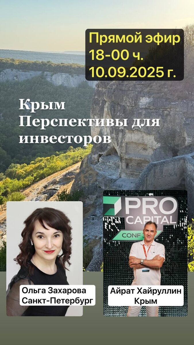 🎙 Прямой эфир: «Крым. Перспективы для инвесторов» 📅 Когда: 10 сентября в 18:00 🎤 Спикеры: Ольга Захарова- эксперт по недвижимости в г. Санкт-Петербург и Айрат Хайруллин - инвест-брокер по недвижимости Крыма. 📉 Крым— это шанс войти в рынок с минимальными рисками и максимальной выгодой. ❔Боязнь вложиться и остаться без прибыли ❔Боитесь юридических подводных камней ❔Как вкладываться в Крым безопасно и получать стабильную маржу ❔Как использовать момент входа, как возможность для роста! 📌 Эфир для тех, кто хочет узнать о перспективах инвестирования в Крым 📲 Готовьте свои вопросы и приходите!