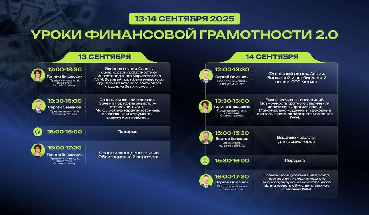 🔥⚡️🔼13-14 СЕНТЯБРЯ. IWM ПРЕДСТАВЛЯЕТ Уроки Финансовой Грамотности 2.0. Двухдневный интенсив. Ваш билет в мир реальных финансов. + Розыгрыш призов! Пока другие тратят время впустую, вы можете получить знания, которые работают. IWM запускает “Уроки Финансовой Грамотности 2.0” – интенсив, где мы говорим о деньгах без прикрас, без лишних слов, но с максимальной пользой. Эта неделя обещает быть особенно полезной. С нами будет Виктор Копылов, основатель Si14 AG. Он поделится тем, что проверено временем и рынком. Что вы получите, став участником нашего двухдневного погружения? 🔥Надежный фундамент: Ваша подушка безопасности. Это реальный, пошаговый план, как создать финансовую опору, которая защитит вас и ваших близких от любых неожиданностей. Инструмент, который дает уверенность в каждом дне. 🔥Криптовалюты: USDT. Вы узнаете, что такое стейблкоин, почему он стал неотъемлемой частью современного портфеля, и как использовать его для безопасного заработка на крипторынке. Больше никаких не