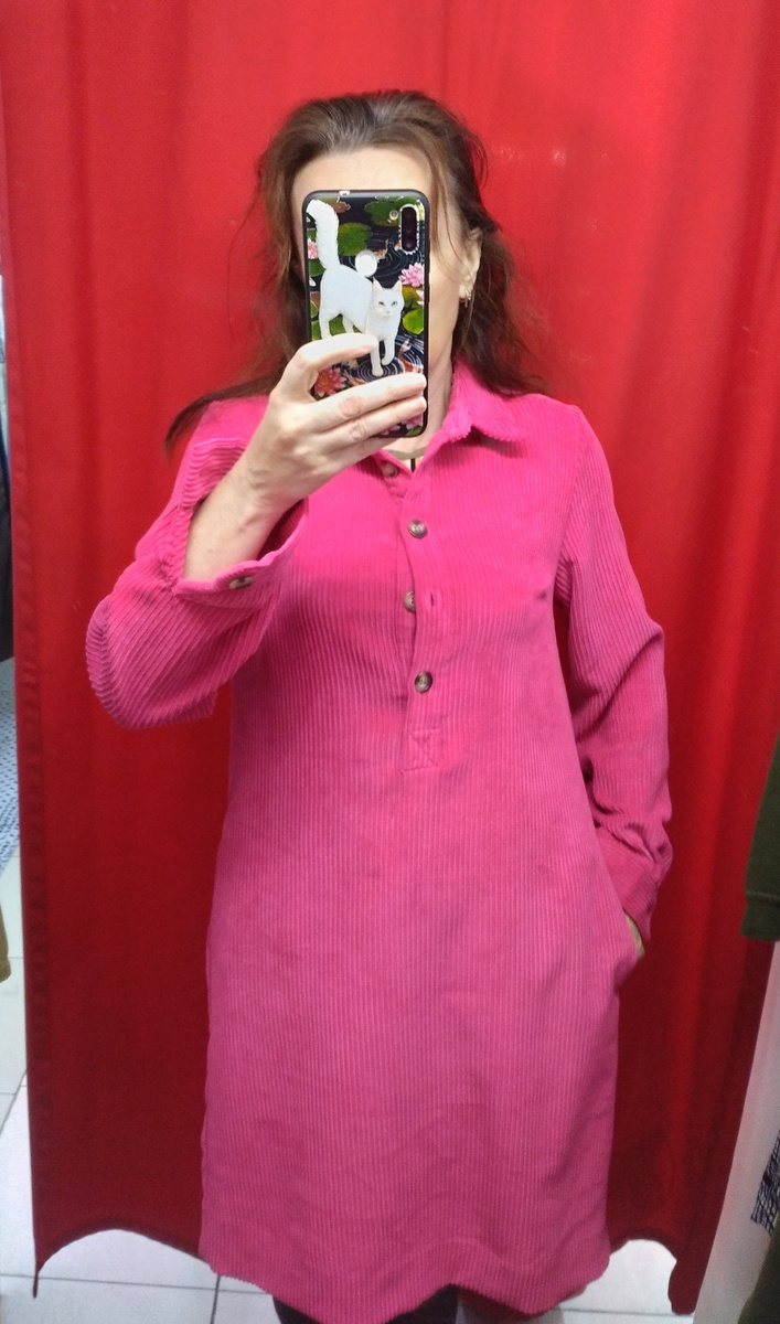 Симпатичное платье несмотря на розовый цвет, который я не очень люблю. Платье трапеция с карманами в боковых швах. Очень мягкий вельвет.