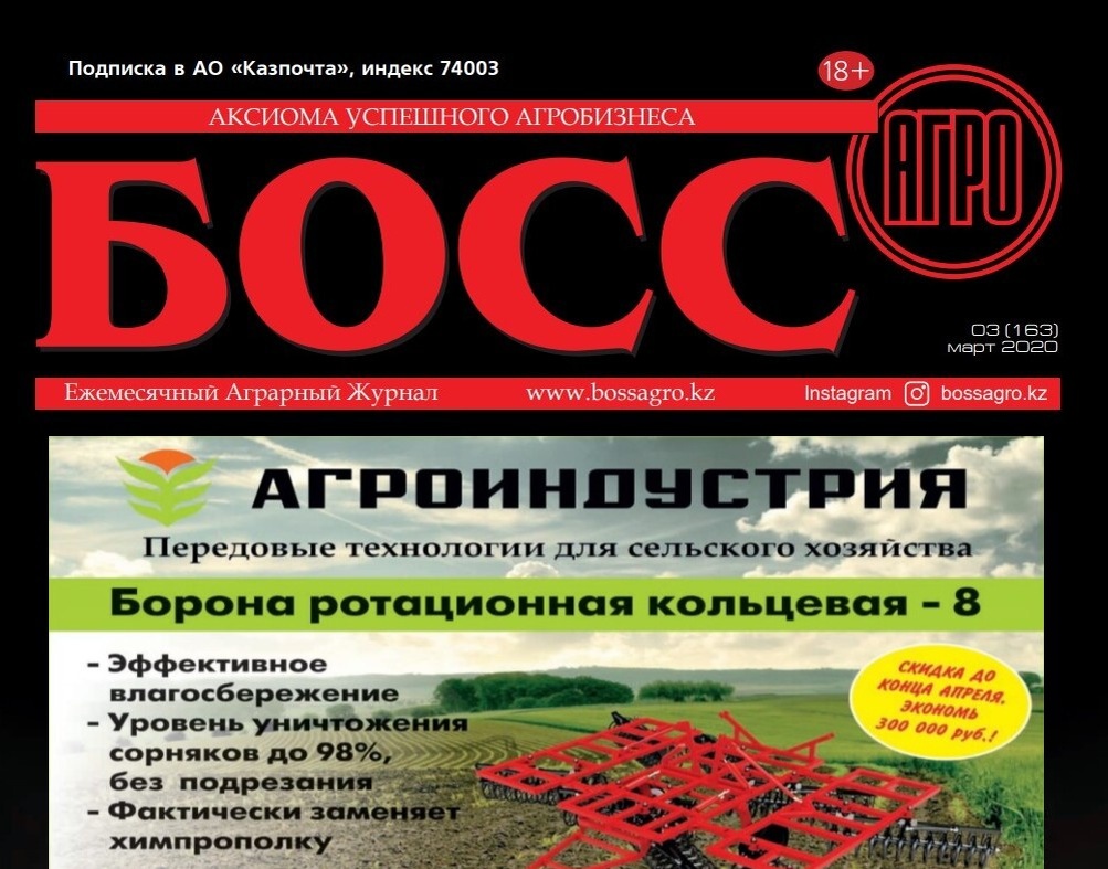 Статья в сельскохозяйственном журнале Казахстана «Босс-Агро».Вышла статья о Бороне ротационной кольцевой БРК -8 производителя Агроиндустрия.