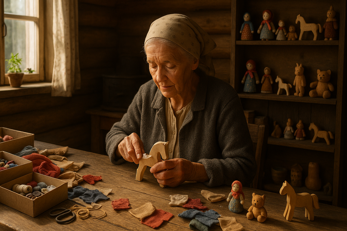 Марья Семёновна встретила меня на крыльце — невысокая, сухонькая. В избе пахло сушёным зверобоем и чем-то сладким, будто только что варили сироп. На длинном столе — коробки с пуговицами, нитками, тряпками, на стене — полки с деревянными заготовками.