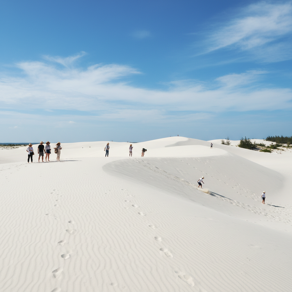 - Белые дюны расположены дальше от Муйне, примерно в 30-35 км, и представляют собой огромный массив светлого песка протяженностью более 10 километров. Ландшафт похож на пустыню Сахара — барханы и волны из белого и бежевого песка. Это место ценят за тишину и масштабность природы — туристов тут меньше, чем на Красных дюнах, и можно гулять часами, наслаждаясь красотой и ощущением пустыни. В окрестностях Белых дюн можно покататься на джипах и квадроциклах, а также попробовать сэндбординг — катание на досках по песку. Большинство туристов совмещают экскурсии между двумя дюнами, красным каньоном и озером лотосов, что делает эту часть Фантьета насыщенной приключениями и фотографиями.