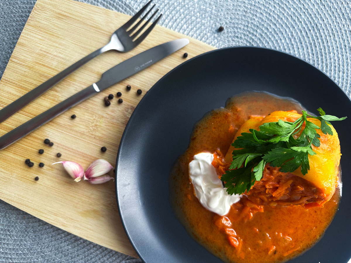 «ФАРШИРОВАННЫЕ ПЕРЕЦЫ » Оказывается, «Фаршированный болгарский перец» это национальное блюдо молдавской и румынской кухни. Я вот не знал) А еще, начинка для фаршированного перца может быть самой разнообразной, его фаршируют рисом и мясом, сыром, ягодами, крупами, рыбой, креветками. Летом и осенью фаршированный перец можно готовить часто, хоть каждый день. На мой взгляд «Фаршированные перцы» одно из самых простых и понятных в приготовление блюд. Главное следовать шагам рецепта и тогда все точно получится. НАМ ПОНАДОБИТСЯ : Перце спелый большой - 7 шт Фарш домашний 400 гр Фару куриный - 400 гр. Рис -100 гр Морковь (небольшая) - 5 шт Лук репчатый - 1 шт (большая головка) Томатная паста - 250 мл Сметана 20/25% 200 мл Соль/ перец - по вкусу Лавровый лист - 1 шт Кинза - 1 пучок Для начала подготовим перцы. Кстати, небольшой лайфхак. Я всегда беру обычный перец, тот который зеленый(такие неказистые), но, в общей куче, попадаются спелые красно/оранжевые экземпляры. Цена такого у