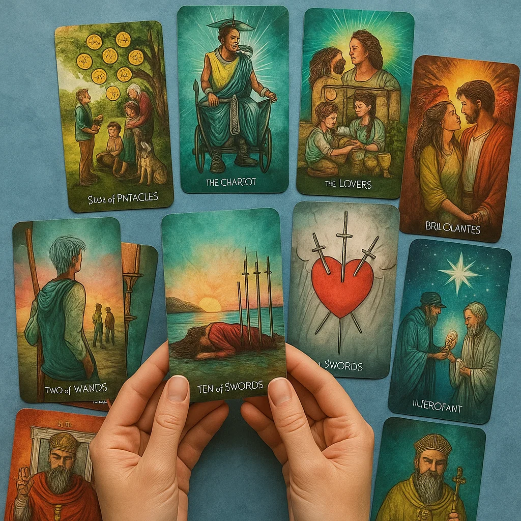 Но рядом лежит Десятка Пентаклей. А это, наоборот, карта родства, семьи, глубинной связи. И это ключевой момент: даже если ваши отношения разрушены внешне, на тонком плане остаётся ощущение, что вы друг другу "свои", как будто родные души. Иногда Десятка Пентаклей показывает, что связь настолько сильна, что её не могут разорвать ни обстоятельства, ни время. Вы могли быть семьёй, могли строить её или хотя бы мечтать об этом. И теперь боль в том, что рушится не просто роман, а что-то большее — идея "мы", идея родного дома, опоры.