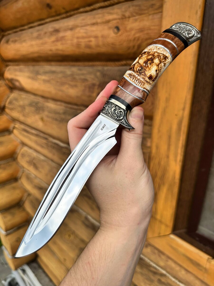 Встречайте: эксклюзив в наличии — *разделочный нож «Волк»* из премиальной стали Elmax с уникальными долами на клинке.