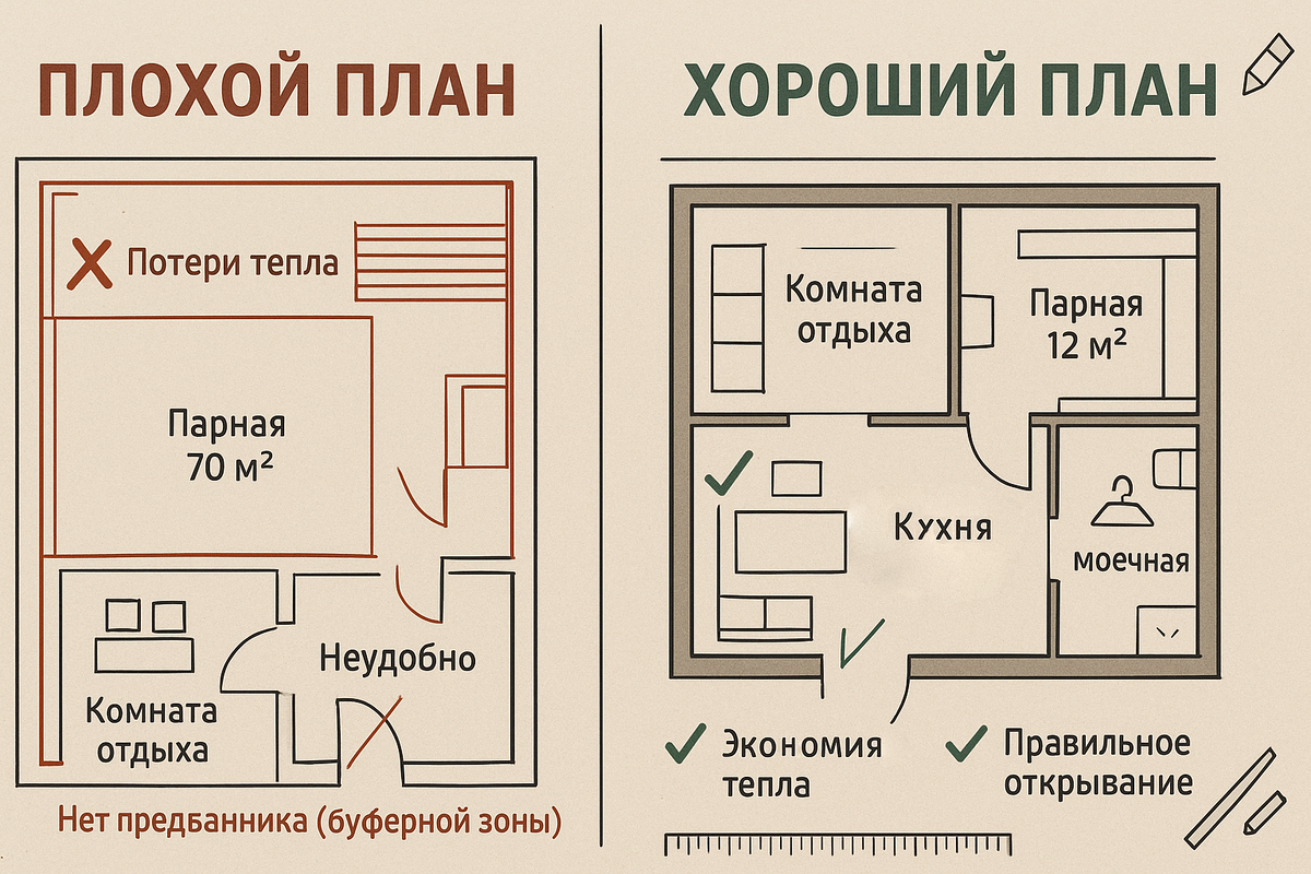 Мечта о собственной бане живёт в сердце почти каждого, кто хоть раз испытал удовольствие настоящего парения. Ведь баня — это не только место для очищения тела, но и ритуал, способ восстановления сил, укрепления здоровья и общения с близкими. Однако, решившись построить баню своими руками, многие новички совершают ошибки, которые в будущем приводят к проблемам: от неудобства использования до серьезных затрат на ремонт. Разберём самые распространённые ошибки, которых стоит избегать. Одна из самых частых ошибок — строить баню «где удобно», без учёта особенностей участка. Совет: оптимальное расстояние от дома — 8–15 метров, место должно быть сухим и желательно с лёгким уклоном для отвода воды. Некоторые считают, что баня — лёгкая постройка, и фундамент можно сделать «на глаз». Это ошибка. Совет: даже небольшая баня требует надёжного основания. Лента или сваи — хороший выбор, но их нужно делать по технологии и с гидроизоляцией. Многие думают: «Чем жарче и плотнее, тем лучше». Но без правиль