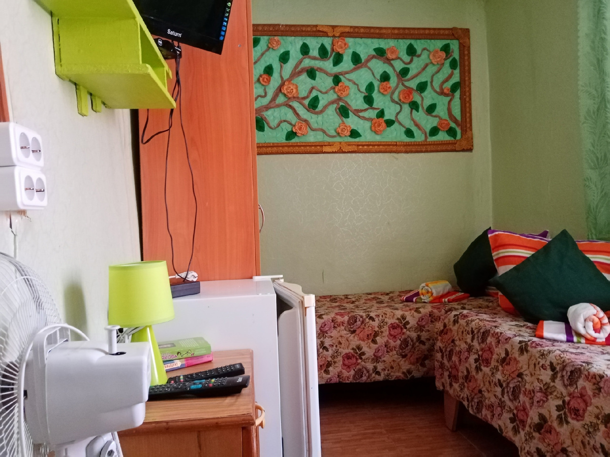Пребудьте с нами, любезный гость, и внимайте сему сказу о горнице, что зовётся «Дикая Роза». во граде гостевом «Сказочный дворик» На чертоге втором, где ветер морской шепчет сказки да солнце целует стены, притаилась светлица малая, да удалая. Наречёна она в честь цветка стойкого, что на скалах приморских алым огнём полыхает - «Дикая Роза». Стены её - словно трава молодая после дождя, светло-зелёные, прохладные. А на стене той - дивное панно цветущее, заморское, диковинные краски коего летнюю песнь поют. Воздух в ней лёгок, ибо ветродуй (коему имя вентилятор) усердно трудится, дабы зной летний отвадить. Обустроено же в светлице сей всё по-хозяйски: Два ложа с тюфяками мягкими для сладкого сна на закатном берегу. Ларь холодильный, дабы сохранить яства да напитки прохладные. Очистительная келья малая, своя, с дождевым душем, чашей умывальной да нужником-стульчаком. Шкаф-страж для одеяний путников да тумбочки-верные слуги у изголовья. Волшебное зеркало (телевизор), показывающее лицезрения