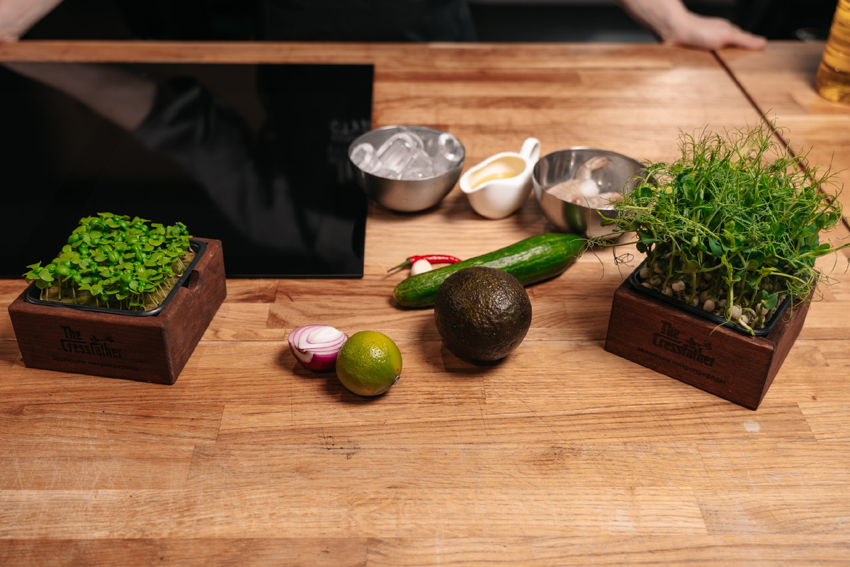Готовим зеленый гаспачо из авокадо с креветками и микрозеленью вместе с с Алексеем Химандритовым (шеф кулинарной студии Юлии Высоцкой) Предыдущий рецепт спринг-роллов уже на нашем канале в Яндекс.Дзен 🔗 🛒Ингредиенты: • Авокадо — 200 г (1-2 спелых плода) • Огурец — 100 г (небольшой, очистить от кожуры) • Лук репчатый — 20 г (небольшой кусочек) • Чеснок — 3 г (1 небольшой зубчик) • Сок лайма — 100 г (примерно из 1-2 плодов) • Оливковое масло Extra Virgin — 30 г • Перец чили — по вкусу (свежий или хлопья) • Лёд — несколько кубиков • Соль — по вкусу 🍽️Для сервировки: • Креветки королевские — 5 шт. • Чиабатта — 1 ломтик • Мини-базилик — 1 лоток (несколько веточек) • Кресс-салат — 1 лоток (или руккола) • Оливковое масло для жарки • Бренди или виски (по желанию, для пикантности) Пошаговый рецепт: ☑️ Шаг 1. Собираем основу Авокадо очистите от кожуры и удалите косточку. Мякоть отправьте в чашу блендера. Туда же добавьте очищенный и крупно порезанный огурец, лук, чеснок, сок лайма и олив