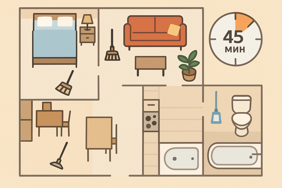 Никаких «генералок до потери пульса». Один таймер на 45 минут раз в неделю — и дом выглядит будто вы «всегда так жили». Метод «5×9 минут»: пять зон по девять минут, только видимые поверхности и то, что бросается в глаза. Не идеал, а оптика порядка. Таймер, корзина «разложить по местам», пакет для мусора, многоразовая салфетка/бумажные полотенца, универсальный спрей. Правило “не успел — не страдай”: таймер прозвенел — двигаемся дальше. Следующий ресет «добьёт» остатки.