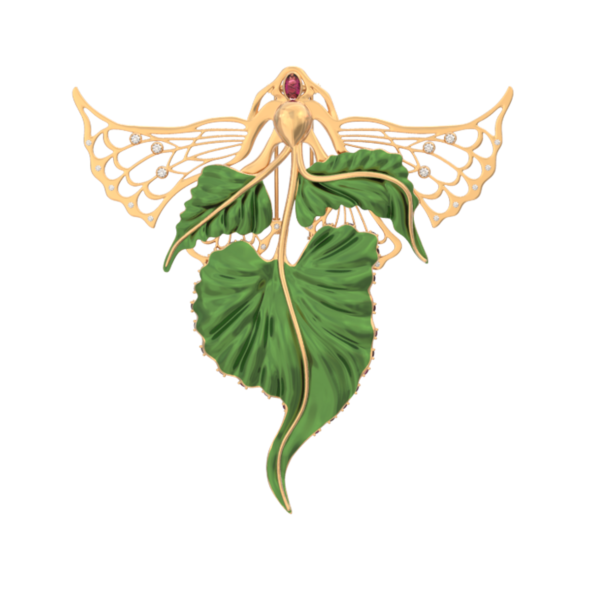 Студентка кафедры технологии художественной обработки материалов и ювелирных изделий СПбГУПТД Елизавета Матюшенко создала коллекцию ювелирных украшений «Адиантум», вдохновленную Ботаническим садом Петра Великого в Петербурге. В коллекцию вошли брошь, колье, серьги и кольцо, выполненные в стиле модерн из желтого золота 750 пробы, горячей эмали, рубинов и бриллиантов. В качестве техники студентка использовала лазерную резку и литье по выплавляемым моделям. Центральным художественным образом коллекции стал папоротник рода Адиантум Перувианский. «Это растение привлекло мое внимание изяществом ажурных листьев, которые формируют сложные перистые структуры с плавными изгибами и радиальной симметрией. Ключевой идеей коллекции стал контраст между статичной элегантностью растения и динамикой скрытой жизни, метафорически воплощенной через мотив мотылька, спрятанного за листьями. Мотылек, как символ трансформации и хрупкости, противопоставляется устойчивой форме папоротника, отсылая к цикличности