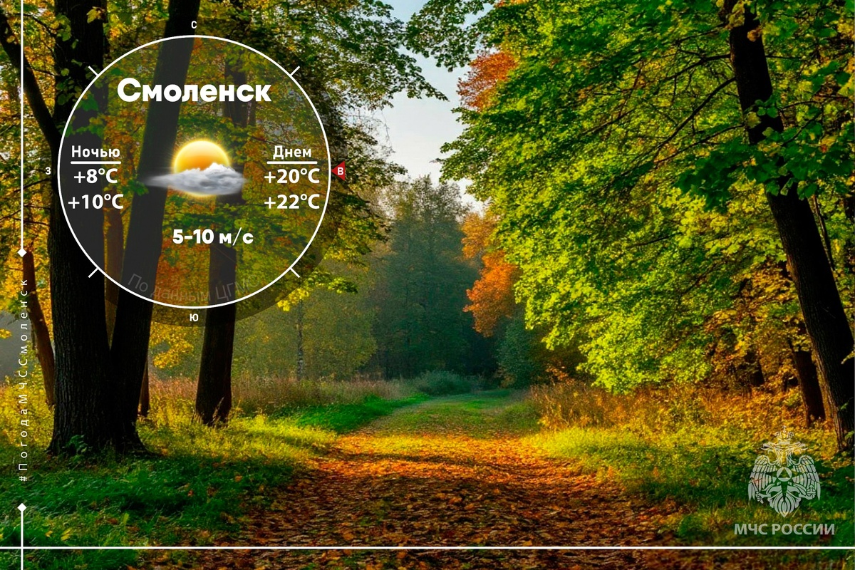 📔Сторис без фильтра? Завтра именно тот день! Завтра, 11 сентября, в Смоленской области по-настоящему приятная и тёплая осенняя погода, словно природа решила сделать передышку перед дождливым сезоном. День обещает быть солнечным и светлым, особенно в дневные часы. Осадков не ожидается, однако в ночные и утренние часы возможен слабый туман, особенно в низинах и вдоль водоёмов. Ветер восточный, умеренный, 5–10 м/с. Температура воздуха: по области: 🌘ночью +5…+10°C, ☀️днём +19…+24°C; в Смоленске: 🌘ночью +8…+10°C, ☀️днём +20…+22°C. Атмосферное давление — 749 мм рт. ст., слабо понижается, но остаётся в пределах нормы. 🔔 Рекомендации от МЧС России: 🍁Будь внимателен в утренние часы. При слабом тумане возможно снижение видимости. На дорогах соблюдай дистанцию и скоростной режим. 🍁Одевайся по погоде. Утром может быть прохладно, особенно в районах с минимальной температурой до +5°C. 🍁Не жги сухую траву и мусор. Сухая и тёплая погода повышает риск возгораний. 🍁Следи за прогнозом.
