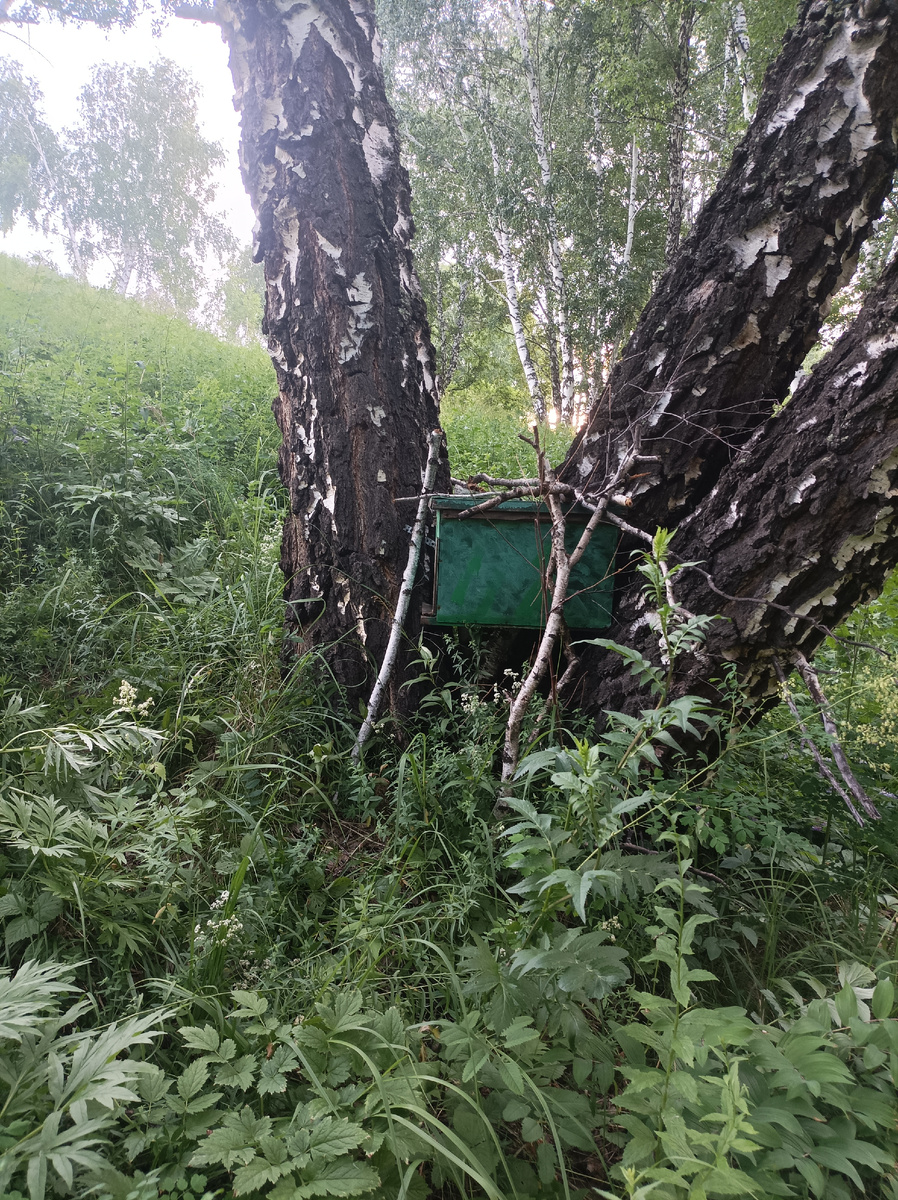 Эвакуированные ловушки перевез на дачу, где подготовил улей, установил его в укромном уголке дачи и пересадил в него все три роя. Вскрытие ловушек показало, что два роя были вполне жизнеспособные, уже успели оттянуть поставленную в ловушки вощину, набрать немного меда и перги, а матки усердно начервили по три рамки расплода. Третий рой был мелкий, вощину едва начал тянуть и расплод был лишь на одной рамке. В результате слияния роев получилась семья- середнячок, в конце июня занимающая один десятирамочный корпус дадановского улья. Всвязи с тем, что возиться с расширением семьи у меня уже не было времени, я просто накинул сверху второй корпус, 8 суши+2 вощины, на этом закончил экзекуцию и уехал на вахту. Через три недели сын подставил еще и магазин.