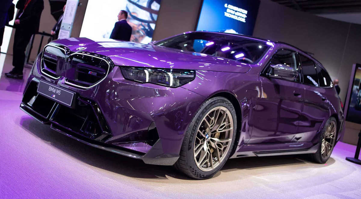 На автосалоне IAA Mobility в Мюнхене BMW представила новый M5 Touring в уникальном цвете Daytona Violet, который мгновенно стал одной из самых заметных звезд шоу. Этот универсал сочетает высокую мощность и передовые технологии с выразительным стилем — благодаря полному карбоновому обвесу и золотым дискам модели 1075 M design в оттенке Frozen Gold Bronze. Под капотом у M5 Touring установлен гибридный силовой агрегат, состоящий из 4,4-литрового V8 TwinPower Turbo и мощного электромотора, суммарная отдача которых достигает впечатляющих 727 лошадиных сил. Такой тандем позволяет разгоняться с места до 100 км/ч всего за 3,4 секунды, а максимальная скорость достигает 306 км/ч с пакетом M Driver’s Package. При этом благодаря батарее ёмкостью 14,8 кВт/ч универсал способен проехать около 40 км на чисто электрической тяге, что значительно повышает универсальность передвижения по городу и экономит топливо. Визуально новинка выделяется своей агрессивной аэродинамикой: передний сплиттер, накладки на