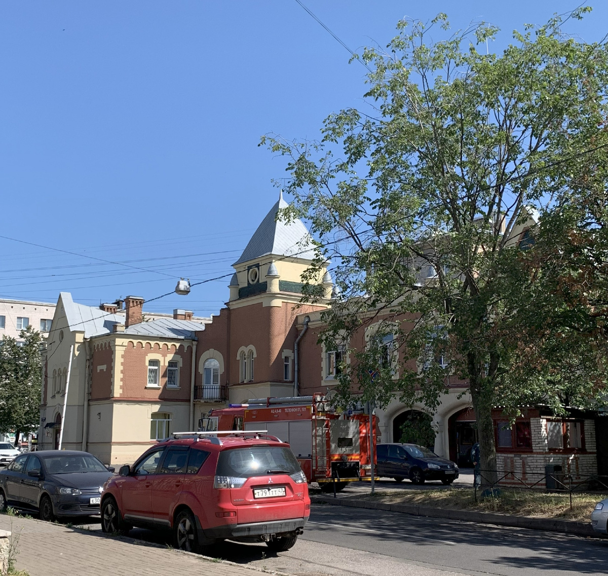 Во-первых, на здании пожарной части уже нет пожарной каланчи. Надобность в каланчевой службе с распространением телеграфа в начале ХХ века отпала. Но, наверное, как напоминание о ней на здании возвышается небольшая башенка.