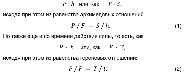 Численные значения которых определялись им, как произведениями, веса тела на высоту его подъема – P * h, так и произведениями величины приложенной к рычагу силы на вертикальное перемещение точки ее приложения – F * S.