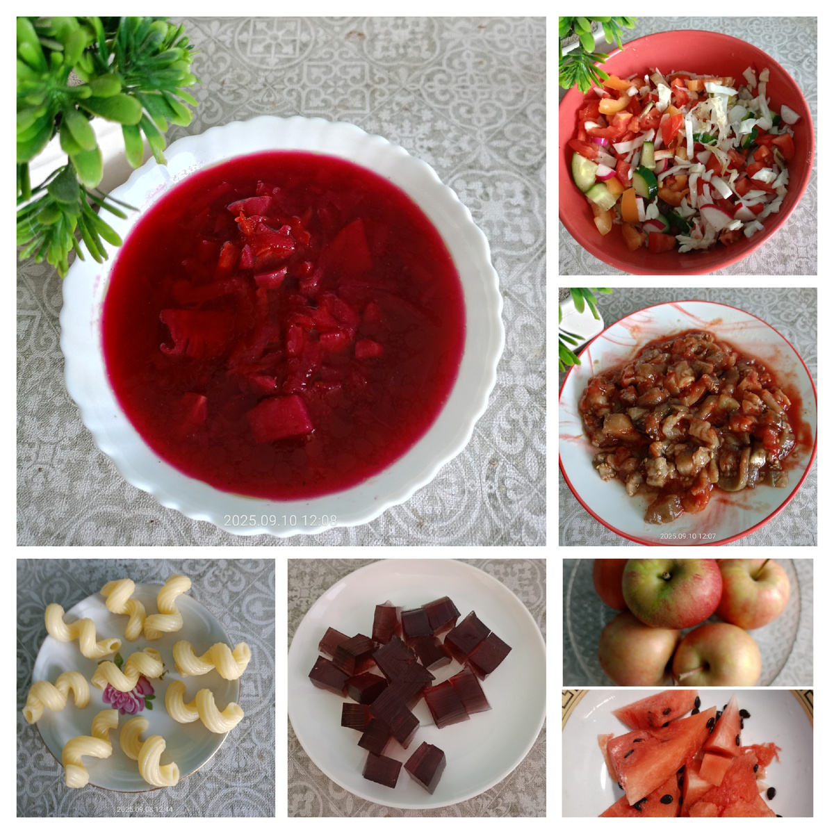 •Завтрак - свекольник; запечённые баклажаны и перец с томатной пастой; холодные макароны вместо хлеба поштучно.