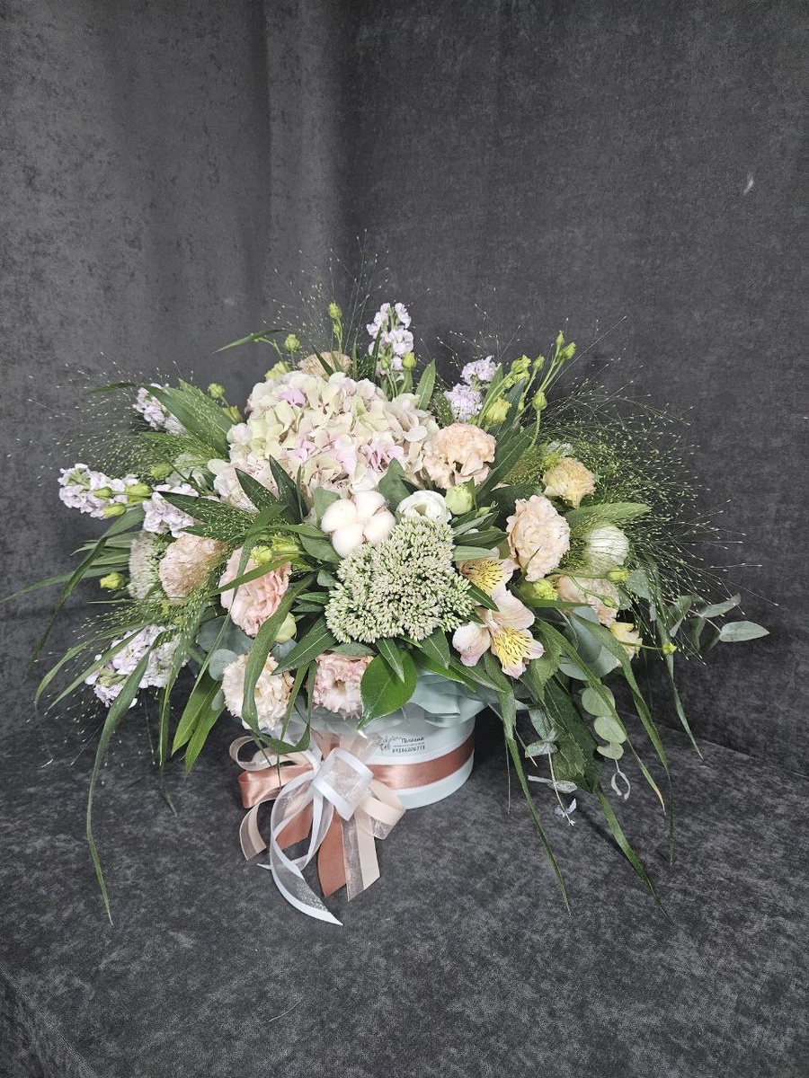 Эта композиция сегодня уехала к имениннице! Очень яркой и благородной, душевной и во всех смыслах замечательной женщине! В составе гортензия, седум, альстрмерия, эустома в двух сортах, матиолла, а так же зелень олеандра, эвкалипт и чудо травушка "Паникум". С днем Рождения Вас, Инна! Очень рады дарить Вам улыбки и помогать Вам дарить их вашим близким!🥰