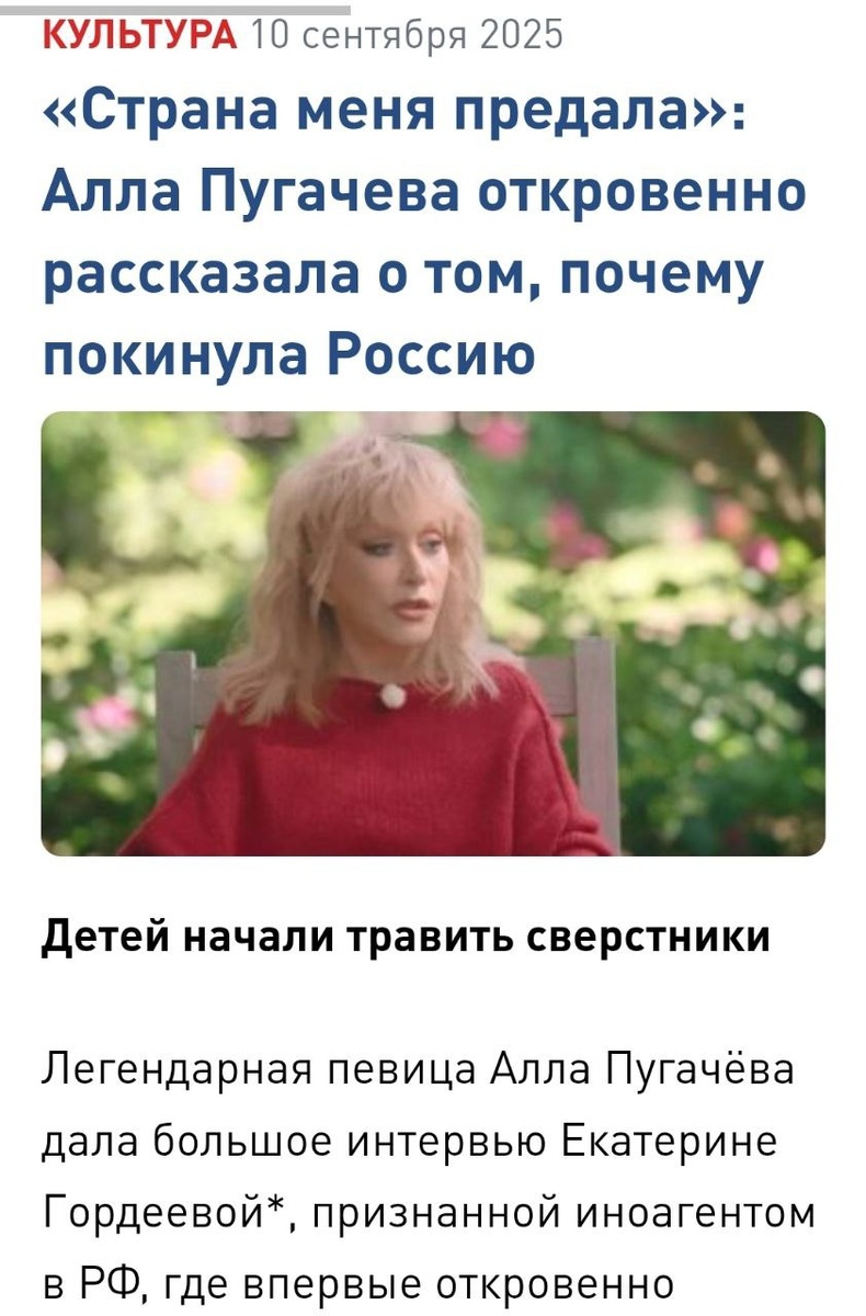 Ее не устраивала "вседозволенность в отношении их семьи". Не вседозволенность их семьи. Как нескромный прямо позиционировано что они избранные. Не скрою, был момент, поддержал Аллу Пугачеву: когда она на выпускницу музыкальной фабрики-конкурса сказала что та рано зазвездилась. Но и тогда непозитивный осадок оставила фактура фразы - Пугачева высветила свою единственно звездность. А её поведение в группе поддержки одного из кандидатов в президенты на теле теледебатах против Владимира Жириновского был пример вообще распаясовшейся звёздной исключительности. Но Владимир Вольфович ее довольно жёстко осадил. И вот теперь она откровенно сказала что "страна ее предала". Пусть это будет на ее совести. Как и множество загубленных карьер людей эстрады.