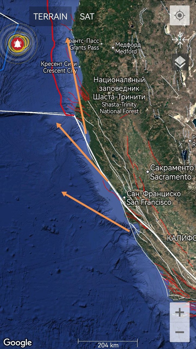 Южное обрамление плиты Горда в Северной Америке остается в тектоническом напряжении уровня М6+ ===== The southern rim of the Gorda Plate in North America remains under tectonic stress at the M6+ level.