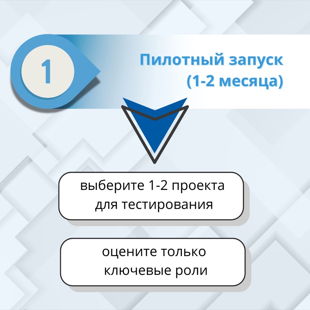 4 шага внедрения системы оценки проектных компетенций Оценка помогает увидеть реальные сильные стороны сотрудников, выявить зоны развития и повысить эффективность проектных команд. Чтобы система не осталась «на бумаге», важно внедрять её постепенно — с обратной связью и корректировками. Вот четыре шага, которые позволяют не просто ввести новый инструмент, а встроить его в реальную практику и культуру компании. Такой подход снижает сопротивление и помогает встроить оценку в культуру компании, делая её реальным инструментом развития.