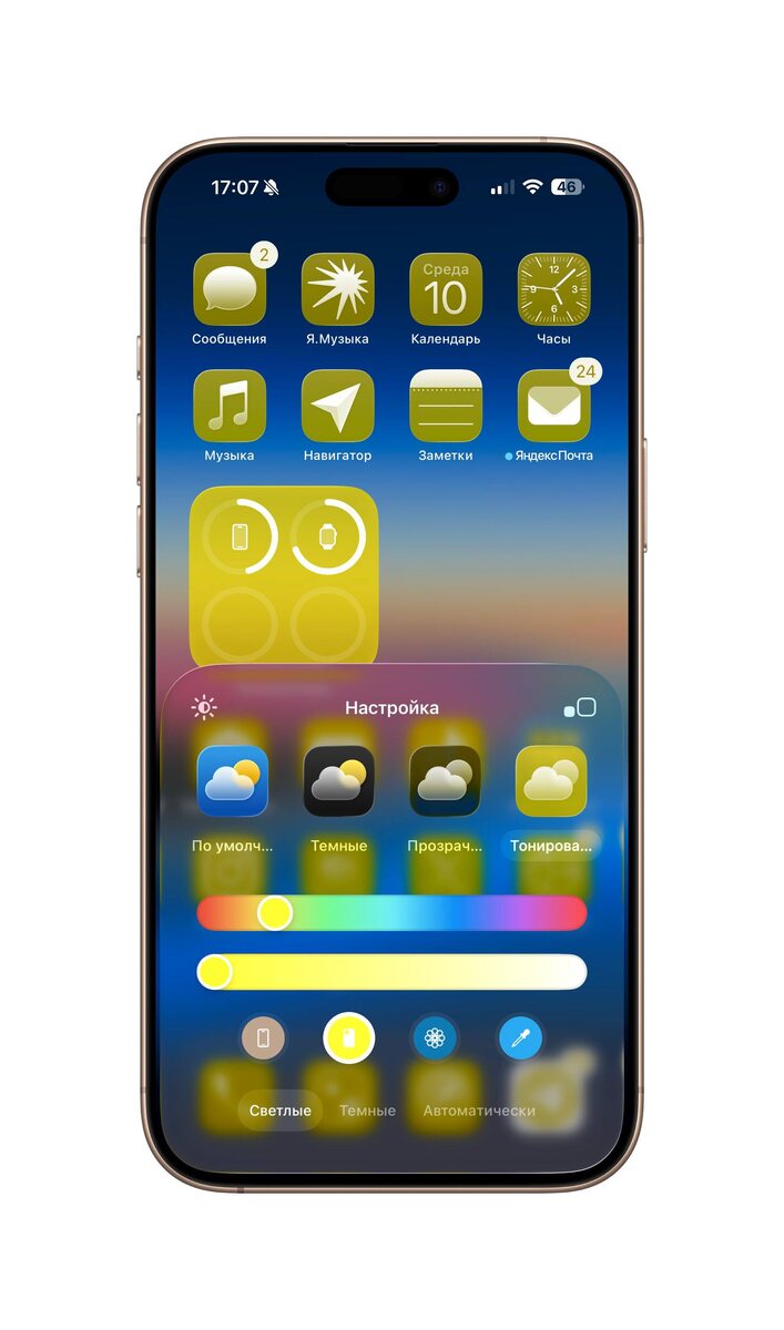 Что нового в iOS 26 В разделе редактирования оформления дополнили раздел «Тонирование». iPhone может перекрасить иконки и виджеты в цвет айфона или точный цвет чехла. Как работает, на видео выше 👆 Копии чехлов: Проверил копии чехлов которые показывали анимацию при надевании. Цвет иконок такие чехлы не меняют.