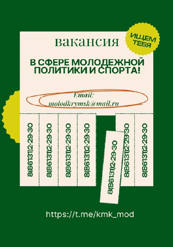 ♥️ Вакансия ♾ Специалист отдела по работе с молодежью, культуре, физической культуре и спорту администрации Крымского городского поселения Крымского района ♥️Приглашаем в команду активного специалиста, который будет развивать спортивное направление в нашем городе! Ваша миссия: 🟢Развитие массового спорта и пропаганда здорового образа жизни 🟢Организация спортивных мероприятий и соревнований 🟢Координация работы спортивных секций и клубов 🟢Взаимодействие с тренерами и спортивными организациями 🟢Работа с документацией Мы ждём, что вы: 🔵Имеете средне специальное/высшее образование 🔵 Знаете нормативно-правовую базу в сфере спорта 🔵 Умеете работать с разными возрастными группами 🔵Обладаете организаторскими способностями 🔵 Энергичны и заряжаете других своим энтузиазмом Что предлагаем: 🟣Официальное трудоустройство по ТК РФ 🟣Социальный пакет 🟣Возможность реализовать свои спортивные проекты 🟣Работу в активной команде единомышленников 🟣Перспективы профессионального роста Контак