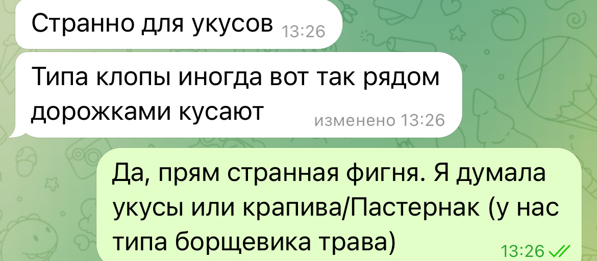 Изначально у мужа на теле стали появляться какие-то пятна, в частности на предплечьях. Как это обычно и бывает, укусы клопов были дорожками. Но нам тогда это ни о чем не говорило. Лето на дворе, и мы подумали, что накусали в деревне. Либо это летящая в разные стороны при скашивании травы крапива попала.