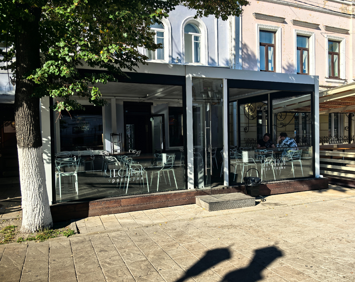 Посещение сентябрь 2025г. Пешеходная улица Почтовая в Рязани самое популярное и насыщенное по части гастрономии пространство города. Здесь расположено порядка 2-х десятков заведений (рестораны, кафе, пиццерии, кофейни, бары) различной направленности и ценовой категории. Есть удачные, есть не очень. В кафе/пиццерии «Чеснок» я был несколько лет назад и в очередной раз, будучи в Рязани, решил повторить визит и зайти сюда на обед. ИНТЕРЬЕР Почти у всех заведений, расположенных на Почтовой, в тёплое время года есть открытые веранды. У «Чеснока» это холодный стеклянный аквариум, слишком серый и слишком строгий. Заглянув внутрь и поняв что из гостей там никого, решил расположить там. Внутри, как и у многих заведений на этой улице, один небольшой зал, в глубине кухня, отделённая от зала стойкой раздачи. Сразу при входе холодильник с десертами, он крадёт пространство, которого здесь не так уж и много и портит весь вид. Интерьер простенький, но симпатичный и по цветовой гамме, и по обстанов