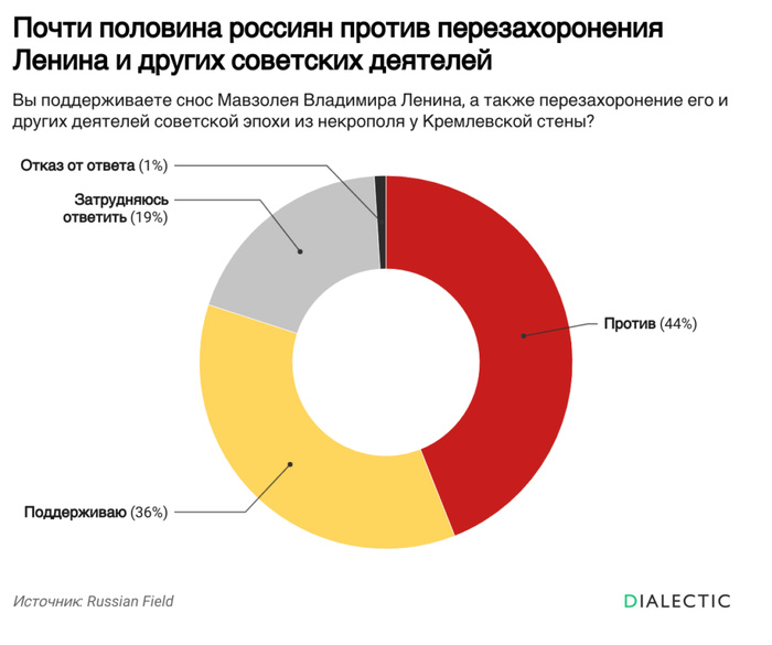 Россияне разделились во мнениях относительно сноса Мавзолея Ленина и перезахоронения тела вождя, а также других советских деятелей, погребенных у Кремлевской стены. Об этом сообщают «Ведомости» со ссылкой на итоги опроса. 44% Респондентов высказались против этой инициативы, в то время как 36% ее поддержали. Почти каждый пятый опрошенный (19%) затруднился с ответом, а 1% отказался отвечать. Опрос выявил четкую корреляцию между политическими взглядами и отношением к перезахоронению. Среди электората КПРФ противников сноса Мавзолея оказалось подавляющее большинство – 72%, хотя 17% сторонников партии все же поддержали эту идею. Среди избирателей «Единой России» против перезахоронения высказались 50%, а 33% ее одобрили. Аналогичная картина наблюдается и среди сторонников «Справедливой России»: 52% против и 38% за. В то же время, сторонники ЛДПР (43%), «Новых людей» (46%), «Яблока» (62%) и не голосующие граждане (42%) чаще поддерживают идею перезахоронения Ленина и других советских деятелей