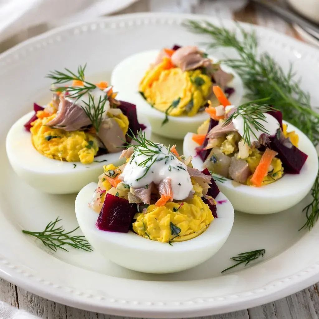 Легко и вкусно: «Селедка под шубой» по-новому – фаршированные яйца с рыбой! Добрый вечер, друзья! 🤝 Хотите удивить гостей? Тогда попробуйте наш рецепт быстрой «селедки под шубой», которая превратится во вкуснейшие фаршированные яйца! 😉 Ингредиенты: - Яйца куриные — 6 шт. (отварные, вкрутую) - Филе сельди (слабосолёной) — 100–150 г (или готовая филе-селёдка без костей) - Свёкла отварная — 1 небольшая (или ½ крупной) - Морковь отварная — 1 шт. - Картофель отварной — 1–2 шт. - Майонез — 3–4 ст.л. (можно смешать с йогуртом для лёгкости) - Лук репчатый — ¼ шт. (по желанию, можно замариновать) - Зелень — для украшения (укроп, петрушка) - Соль, перец — по вкусу Приготовление: 1. Яйца разрежьте пополам вдоль и аккуратно извлеките желтки ложечкой. 2. Желтки разомните вилкой до однородности. 3. Филе сельди мелко порежьте кубиками. 4. Свеклу, морковь и картофель натрите на мелкой тёрке отдельно друг от друга. 5. Лук измельчите мелкими кусочками (если используете)