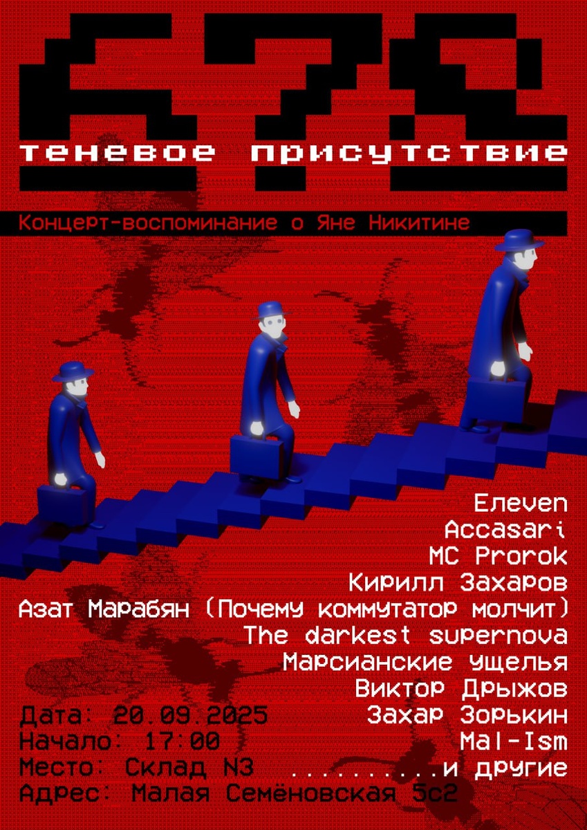 Москва ● Склад №3 ● 20.09.2025 (Сб) ● 17:00 #avantgarde #electronic #experimental #post ► 678. Теневое присутствие. Концерт-воспоминание о Яне Никитине ● TG ● VK Концерт-воспоминание для всех, кто любит творчество Яна Никитина и Театра Яда Участники: ► EЛEVEN ● VK ► Accasari ● TG ● VK ► MC Prorok ► Кирилл Захаров ● VK ► Захар Зорькин (вдовий вдох) ● VK ► Марсианские Ущелья ● VK ► Азат Марабян (почему коммутатор молчит) ● VK ► The darkest supernova ► Виктор Дрыжов (DUKKHA) ● VK ► Mal-Ism ● VK Билеты от 678