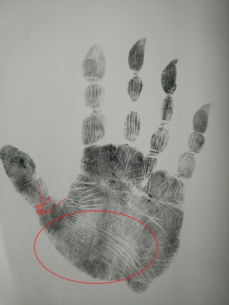 ✅Размер, форма и положение большого пальца рассказывают о многом. Как известно, в Индии некоторые мастера не анализируют ладонь, так как большой палец максимально информативен. Линии и знаки на нём показывают главные уроки для его обладателя. В нашей стране эти знания не так распространены, многие традиционные трактовки требуют проверки современной статистикой, но всё же большой палец остаётся красноречивым. 👉Представлен отпечаток ладони женщины. ✅Хорошо оформленный большой палец, на второй фаланге «талия», человек волевой, дипломатичный. Большую часть своей жизни женщина занимала руководящие посты в общественных структурах с немалым штатом сотрудников в подчинении. ✅Рати, или линия брака, расщеплена — у женщины было два брака. Один из отрезков имеет остров — проблемы со здоровьем первого мужа. От верхней фаланги большого пальца опускается линия врага, в соприкосновении с которой на Рати мы видим фигуры креста и треугольника — пристрастие первого мужа к алкоголю, которое и разрушило б