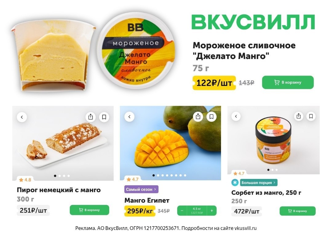 Мангомания во ВкусВилл 🦸 🥭 Манго Египет 🥭 Сорбет из манго, 250 г 🥭 Мороженое сливочное "Джелато Манго" 🥭 Пирог немецкий с манго Проверяйте наличие на сайте или в приложении ❗️ Промокоды на первый онлайн-заказ: ▪️ VSTS37B — скидка 250 ₽ от 1250 ₽ ▪️ 30VGFTTB — скидка 300 ₽ от 1500 ₽ ▪️ 35VNN7BM — скидка 350 ₽ от 2500 ₽ Реклама. АО ВкусВилл, ОГРН 1217700253671. Подробности на сайте vkusvill.ru erid: 2Vtzqv9h33y
