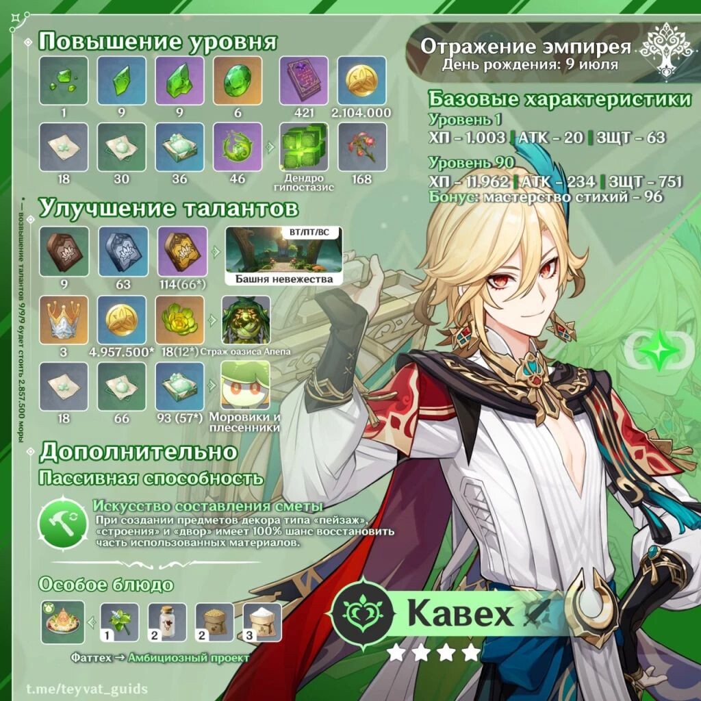 ㅤЕсли вам нравится игра через реакции, связанные с Бутонизацией, и вы думаете, кого туда поставить, то Кавех определённо стоит внимания, особенно если на вашем аккаунте нет большого количества 5 ★ персонажей. Ну, а если вам не нравится подобный тип геймплея, то лучше сохранить свои ресурсы на прокачку других персонажей.