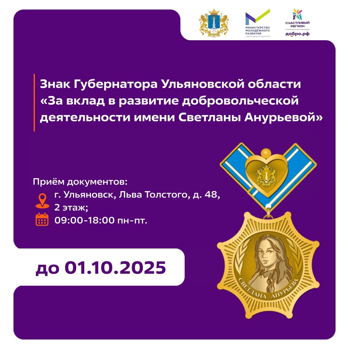 Знак Губернатора Ульяновской области имени Анурьевой: именно Вы можете получить заслуженное признание!🏅 Открыт приём документов на Знак Губернатора Ульяновской области «За вклад в развитие добровольческой деятельности (волонтёрства) имени Светланы Анурьевой». Знаком награждаются люди, внёсшие большой вклад в развитие добровольчества на территории Ульяновской области, проявляющие активность в сохранении и приумножении традиций милосердия, помогающие людям, реализующие социально значимые проекты и программы. Как стать кандидатом на получение награды? 1️⃣ Изучите карточки; 2️⃣ Посмотрите положение и перечень документов, необходимых для участия в комментариях; 3️⃣ Передайте представление к награждению в Ресурсный центр по адресу ул. Льва Толстого, д. 48 (2 этаж) до 1 октября 2025. 📞 Консультацию по вопросам подготовки документов можно получить по телефону: +7 (842) 258-87-94 или email: 727728@list.ru