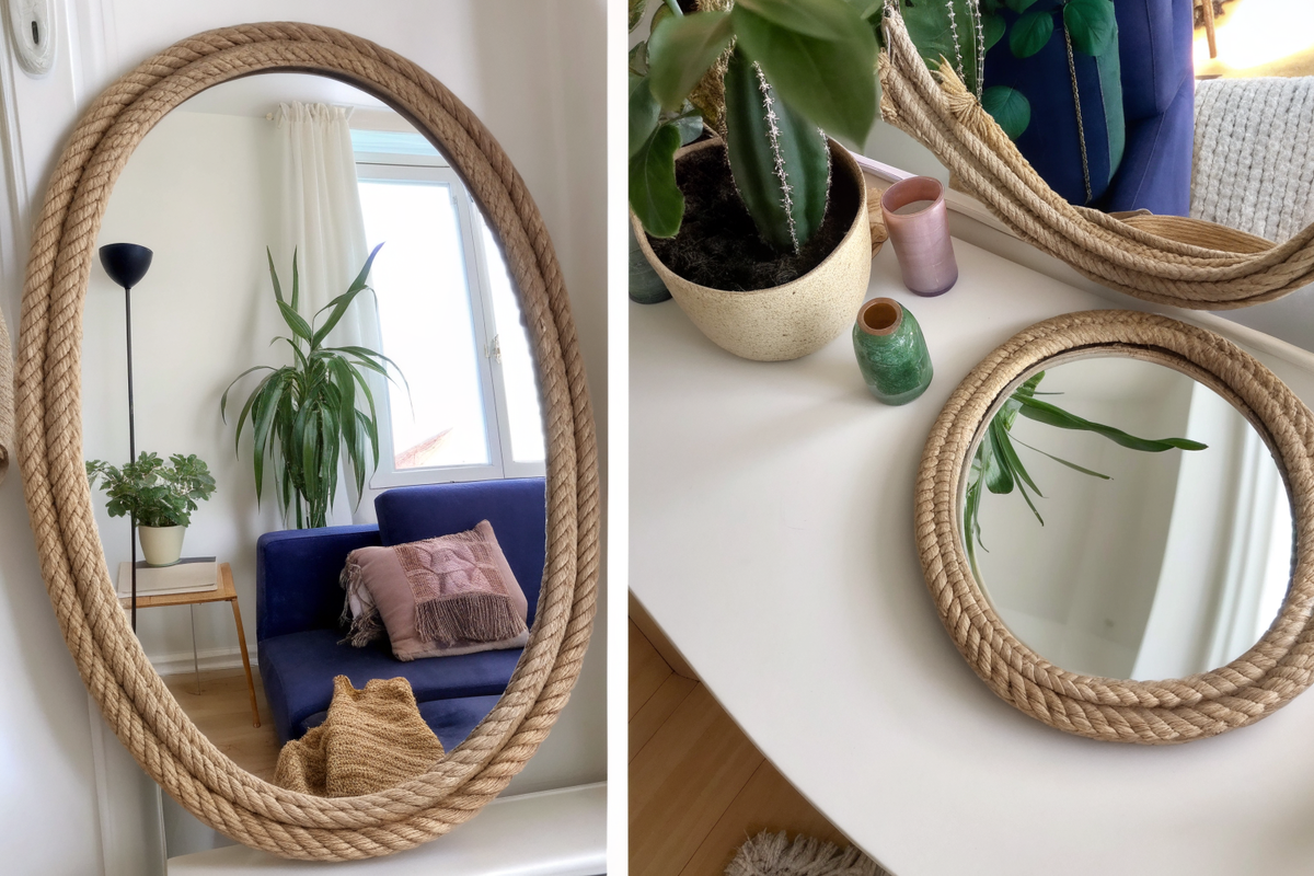 Отмерьте количество каната, учитывая периметр зеркала с небольшим запасом. Из джутового шпагата сплетите косичку – это добавит текстурности будущей раме. Длина косички должна соответствовать длине основного каната. 3. Создание композитной рамки
