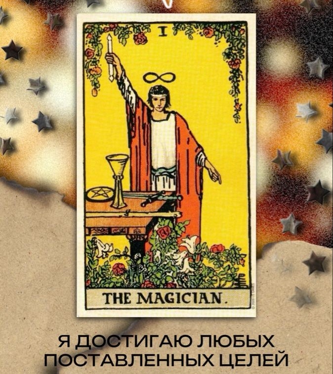 Привет, друзья и коллеги по Таро! Продолжаем наше захватывающее путешествие по Старшим Арканам, и сегодня наш герой – Маг (I)! Если Шут (0) – это наивное начало, то Маг – это осознанная воля, умение взять идею и воплотить ее в материальном мире. Это карта целеустремленности и активности. Давайте разберем его ключевые символы: • Цифра I: Символизирует начало, инициативу и активное действие. • Знак бесконечности (лежачая восьмерка / лемниската) над головой: Это не просто символ, это знак перерождения, бесконечного движения души и постоянного совершенствования. Он также присутствует в виде змеи, кусающей себя за хвост, на его поясе, символизируя цикличность и постоянное развитие. • Жест "Что наверху, то и внизу": Правая рука с жезлом поднята к небу, левая указывает на землю. Этот жест означает способность Мага получать идеи из высшего мира и воплощать их в нашей материальной реальности. • Стол с четырьмя стихиями (Жезл, Кубок, Меч, Пентакль): Маг не просто мечтает, у него есть все необход