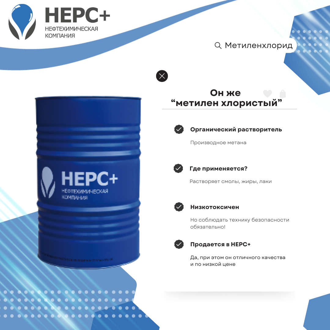 Продолжаем серию коротких постов-знакомств с продукцией НЕРС+ Метиленхлорид, он же дихлорметан, — органическое соединение, производное метана, а также один из самых востребованных растворителей в промышленности и лабораториях. В нем сочетаются высокая летучесть, относительно низкая токсичность и эффективность, поэтому он так незаменим во множестве процессов. Метиленхлорид используют для растворения смол, жиров, битума и лаков, а также для обезжиривания поверхностей. Благодаря легкому испарению он применяется при производстве полиуретановых пен, в 3D-печати — для сглаживания поверхности моделей из ABS и других пластиков, а также в смесях для снятия лака. В пищевой промышленности его используют для декофеинизации кофе и получения экстрактов хмеля. Несмотря на широкое применение, метиленхлорид требует строгого соблюдения техники безопасности: работать с ним нужно под вытяжкой, в перчатках, которые не пропускают растворитель (не латекс и не нитрил). Его пары могут вызывать головокружение,